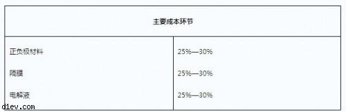 按照鋰離子電池的原材料成本分析結(jié)果,正負(fù)極材料、隔膜和電解液的份額基本相當(dāng),即不能忽略其中的任一環(huán)節(jié),如下表所示?! ?