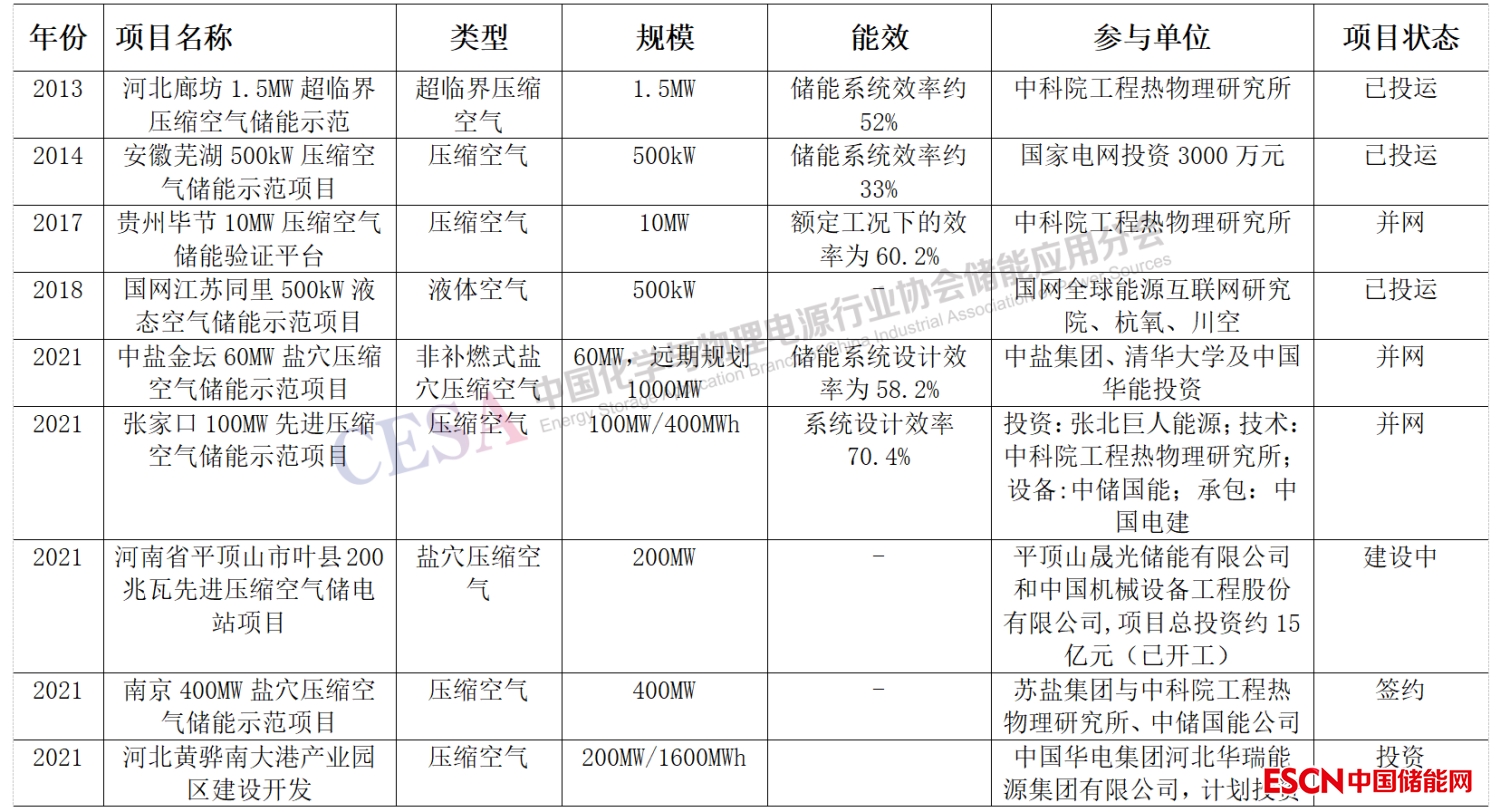 表2 我國(guó)已建和立項(xiàng)的壓縮空氣儲(chǔ)能項(xiàng)目