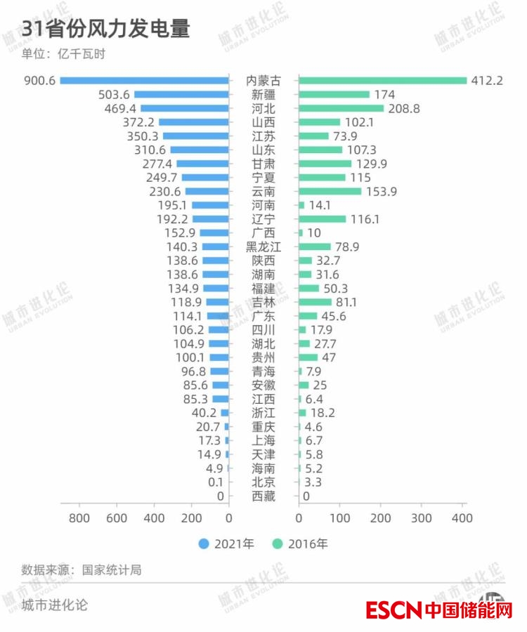 2021年,風(fēng)力發(fā)電量前10名省份中,有8個都來自“三北”地區(qū),內(nèi)蒙古、新疆及河北分別位列前三。