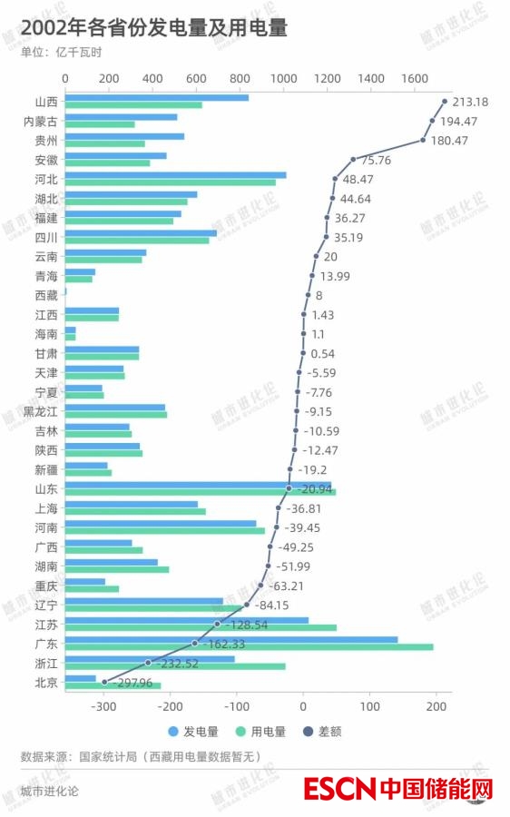 不僅如此,2002年,除廣東外,山東、江蘇、河北的發(fā)電量也均超過1000億千瓦時;其后是河南(876.8億千瓦時)、山西(842億千瓦時)、浙江(778.2億千瓦時)和遼寧(725.3億千瓦時)——彼時,廣大西部地區(qū)的電力資源還有待開發(fā)。