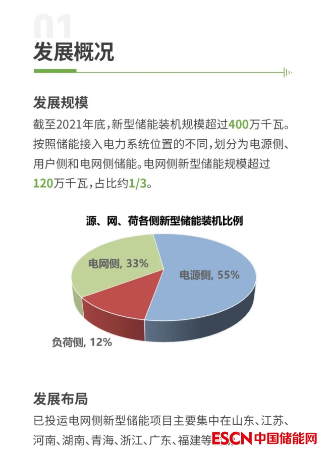 中國(guó)儲(chǔ)能網(wǎng)訊:近日,電規(guī)總院發(fā)布了《電網(wǎng)側(cè)新型儲(chǔ)能發(fā)展需求分析》PPT。PPT顯示截至2021年底,新型儲(chǔ)能裝機(jī)規(guī)模超過400萬千瓦。按照儲(chǔ)能接入電力系統(tǒng)位置的不同,劃分為電源側(cè)、用戶側(cè)和電網(wǎng)側(cè)儲(chǔ)能。電網(wǎng)側(cè)新型儲(chǔ)能規(guī)模超過120萬千瓦,占比約1/3。已投運(yùn)電網(wǎng)側(cè)新型儲(chǔ)能項(xiàng)目主要集中在山東、江蘇、河南、湖南、青海、浙江、廣東、福建等省份。