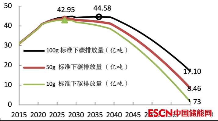 電力行業(yè)要達(dá)到“準(zhǔn)零碳排放”標(biāo)準(zhǔn),碳排放總量要比 2020 年減少 30 億噸。從發(fā)展過程來看, 50克/千瓦時的標(biāo)準(zhǔn)可以促使電力行業(yè)在 2027 年左右達(dá)峰,峰值排放量達(dá)到 42.95 億噸,如圖2。若以 100克/千瓦時的排放標(biāo)準(zhǔn),碳達(dá)峰時間大約在 2037 年,后續(xù)的碳中和目標(biāo)實現(xiàn)壓力很大。