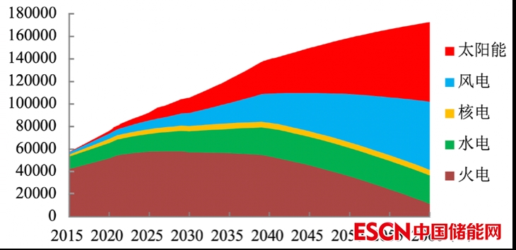 在碳達(dá)峰至碳中和期間,電力生產(chǎn)總量是增加的,年均增長率 2.1%~2.3%。2015年至2060 年,全國電力生產(chǎn)總量,以及火電、水電、核電、 風(fēng)電和太陽能發(fā)電量變化趨勢如圖 1。