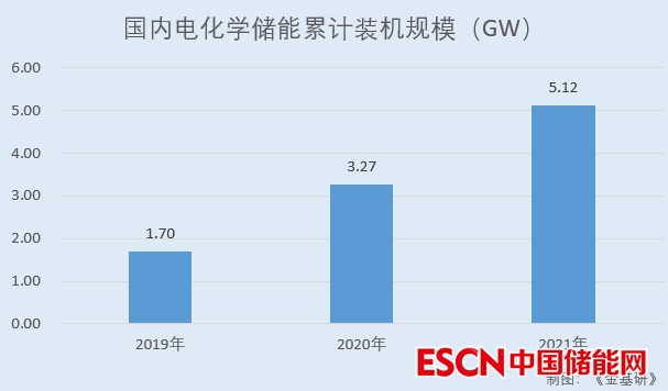 據中國化學與物理電源行業(yè)協(xié)會儲能應用分會的統(tǒng)計數據,2019-2021年,國內電化學儲能累計裝機規(guī)模分別為1.70GW、3.27GW、5.12GW,近三年復合增長率達73.54%。