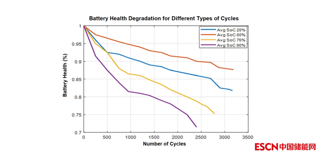 橙色曲線(最佳情況,平均SoC 50%)2000次循環(huán)后保持了92%的SoH。相比之下,紫色曲線(最壞情況,平均SoC 90%)在同樣的2000次循環(huán)中電池SoH只有77%。