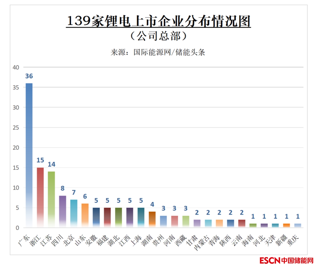 國(guó)際能源網(wǎng)/儲(chǔ)能頭條(微信號(hào):chuneng365)梳理126只市值過(guò)百億的鋰電池概念股的總部所在地。從省份分布來(lái)看,廣東是中國(guó)鋰電第一大省,有36家市值百億的鋰電池上市公司,占了全國(guó)總數(shù)的28%;民營(yíng)經(jīng)濟(jì)最發(fā)達(dá)的浙江也不負(fù)眾望,擁有15家鋰電池上市企業(yè)。