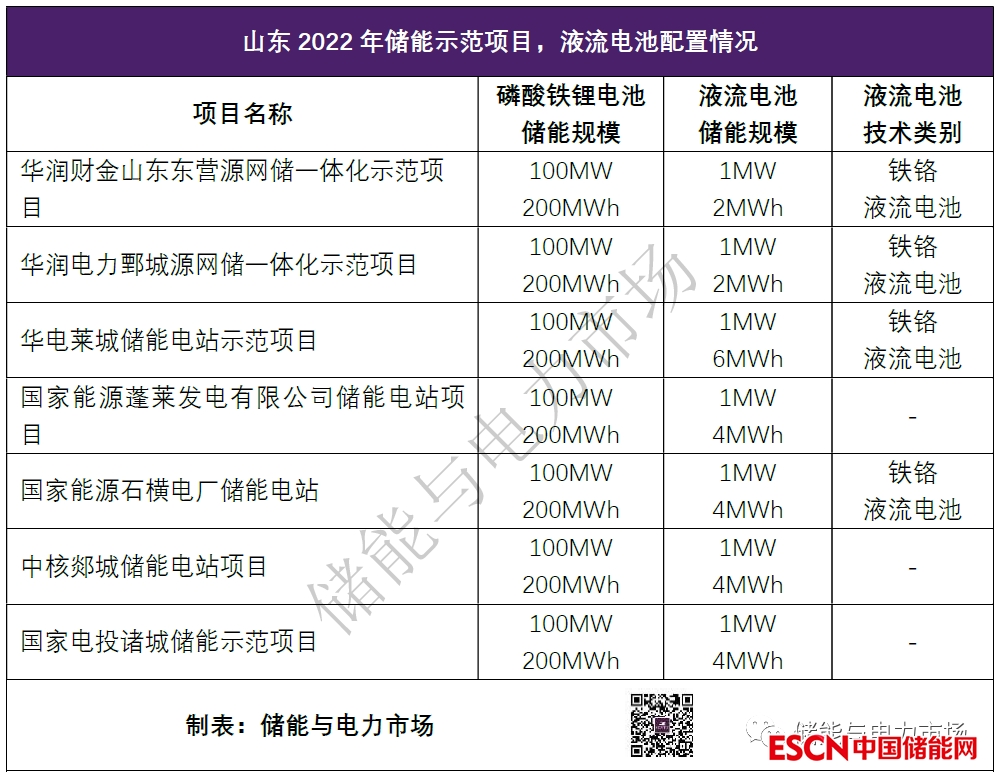 在山東省2022年儲能示范項目中,有多個項目選擇搭配小規(guī)模的液流電池儲能系統(tǒng)。部分配置液流電池的儲能項目如下表所示。
