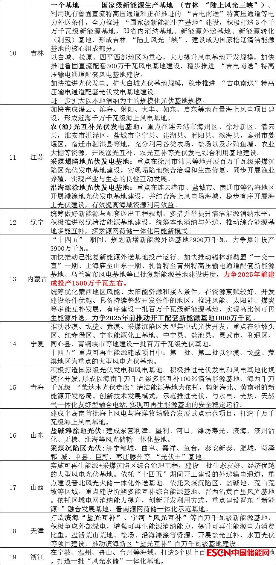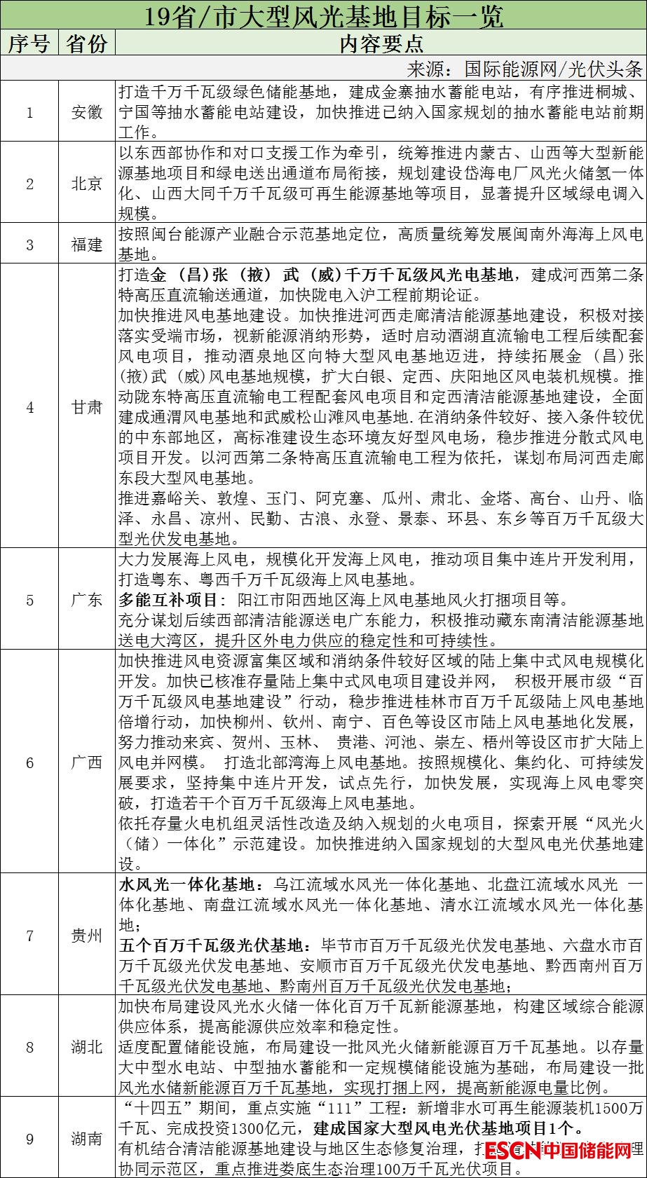 大型風(fēng)光基地時(shí)代已到來(lái),各地也在出臺(tái)的“十四五”能源發(fā)展規(guī)劃的文件中明確支持。據(jù)國(guó)際能源網(wǎng)/光伏頭條(PV-2005)不完全統(tǒng)計(jì),目前已有安徽、北京、福建、甘肅、廣東、廣西、貴州、湖北、湖南、吉林、江蘇、遼寧、內(nèi)蒙古、寧夏、青海、山東、山西、天津、浙江19省/市明確提出風(fēng)光大基地的建設(shè)目標(biāo)以及相關(guān)規(guī)劃。