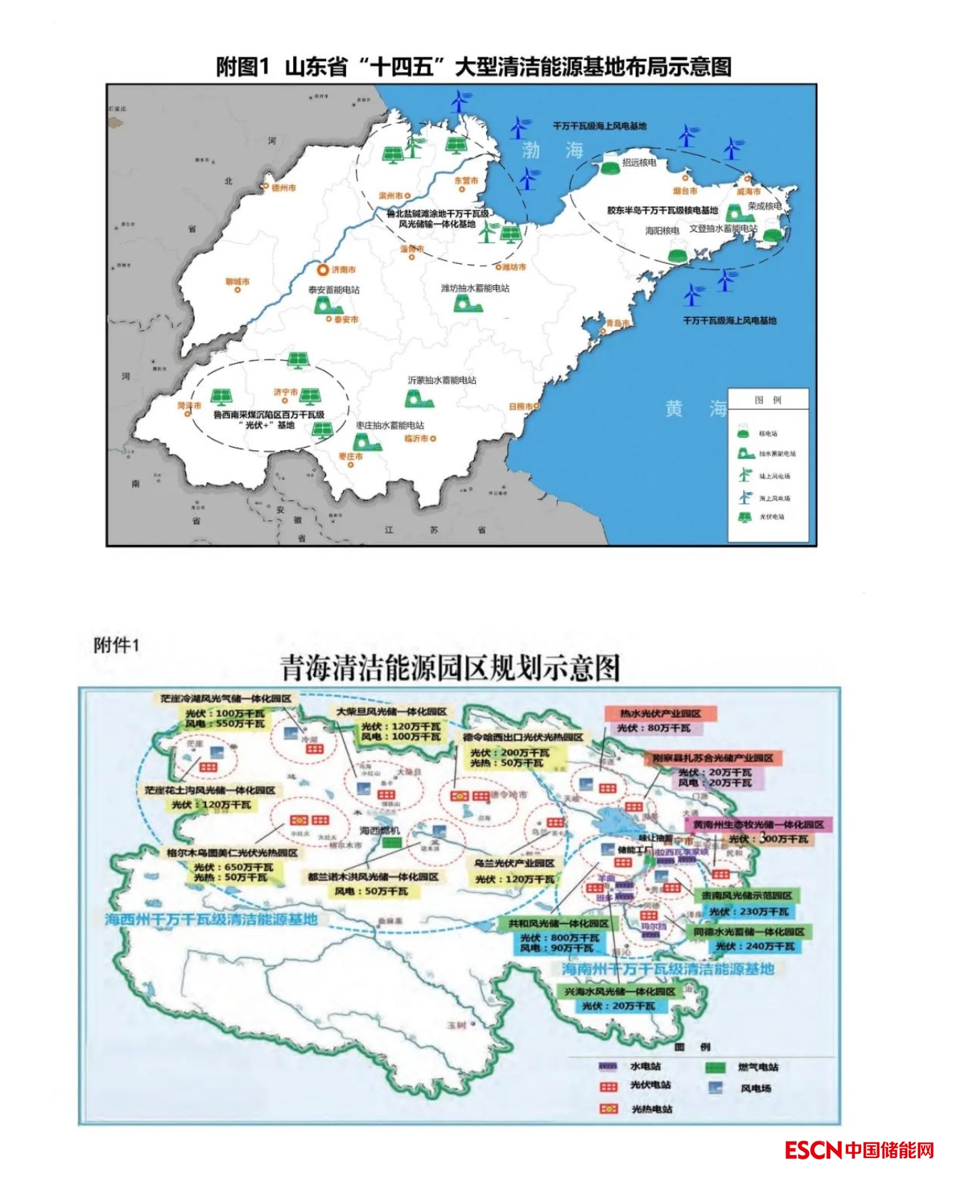 此外,山東、青海兩省在能源“十四五”規(guī)劃中提出了大型風(fēng)光基地規(guī)劃圖。