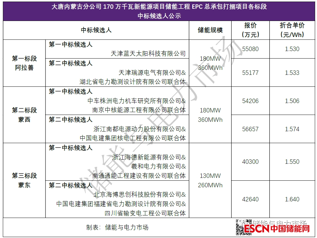 結(jié)合此前發(fā)布的蒙東標(biāo)段結(jié)果,至此490MW/960MWh儲(chǔ)能EPC集采全部完成,三個(gè)標(biāo)段中標(biāo)候選人的報(bào)價(jià)區(qū)間在1.506~1.640元/Wh之間。