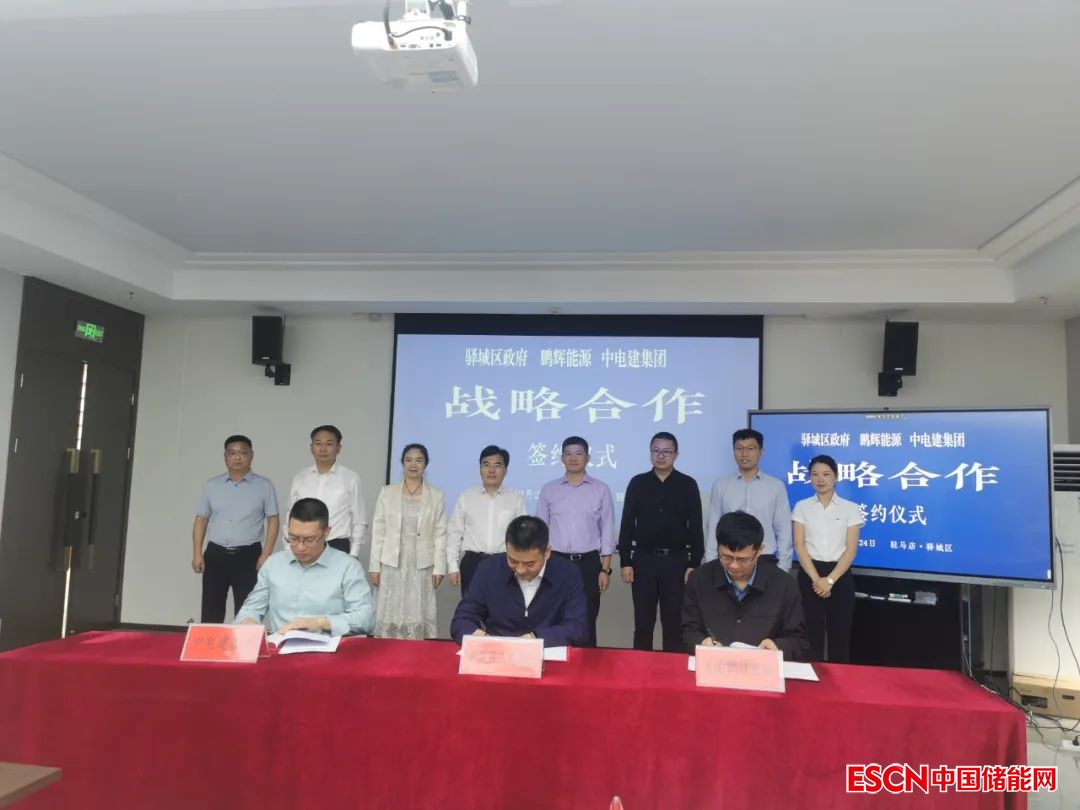 儀式上,馮磊、夏信德、韓曉勁簽署驛城區(qū)人民政府、河南省鵬輝電源有限公司與中電建新能源集團(tuán)有限公司華東分公司戰(zhàn)略合作框架協(xié)議。