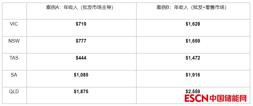 下表第一欄顯示了以批發(fā)市場為重點的電池的年收入(案例A),第二欄顯示了以批發(fā)和零售市場為重點的電池的年收入(案例B)。
