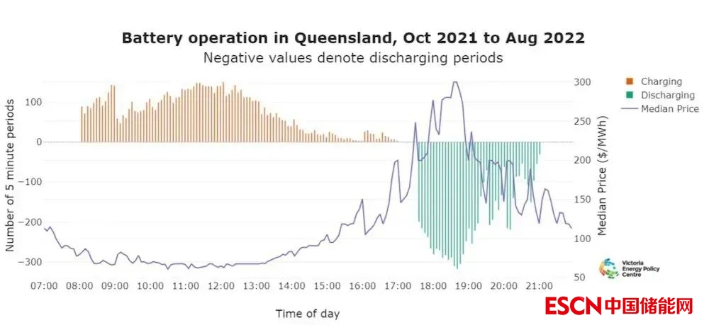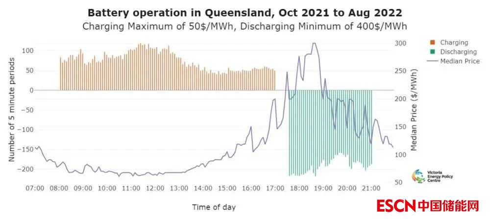 相反,可以看到,電池很可能在下午5點30分至7點30分放電,此時價格往往是最高的(圖表中的藍(lán)線是昆士蘭在每個區(qū)間的現(xiàn)貨價格中值)。