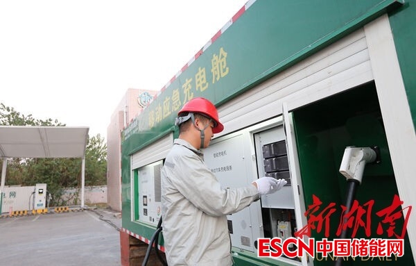 △國網(wǎng)衡陽供電公司員工在京港澳高速公路耒陽服務(wù)區(qū)調(diào)試應(yīng)急充電艙。陳妍霏 攝