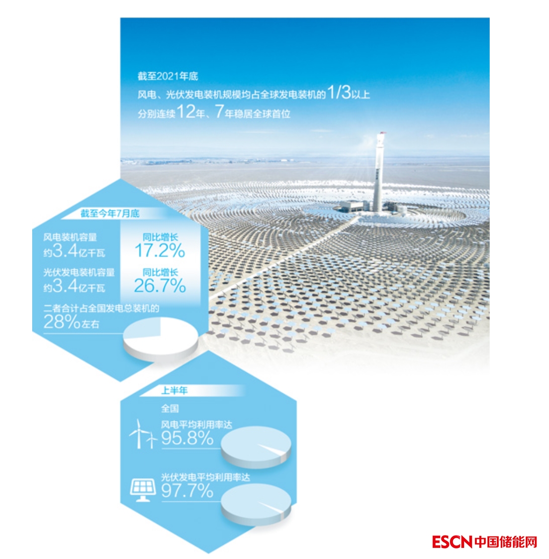 今年以來,我國新能源裝機(jī)規(guī)模穩(wěn)步擴(kuò)大。截至7月底,風(fēng)電裝機(jī)容量約3.4億千瓦,同比增長17.2%;光伏發(fā)電裝機(jī)容量約3.4億千瓦,同比增長26.7%;二者合計(jì)占全國發(fā)電總裝機(jī)的28%左右。同時(shí),新能源消納利用水平不斷提升。上半年,全國風(fēng)電、光伏發(fā)電平均利用率分別達(dá)到95.8%、97.7%,12個(gè)省份“風(fēng)光”利用率達(dá)到100%。
