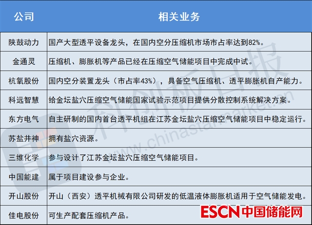 壓縮空氣儲能的產(chǎn)業(yè)鏈主要分為上游設(shè)備、資源供應(yīng):核心設(shè)備包括空氣壓縮機(jī)、透平膨脹機(jī)、蓄熱換熱系統(tǒng)等,此外還需要儲氣鹽穴資源等;中游領(lǐng)域?yàn)榧夹g(shù)提供與項(xiàng)目建設(shè);下游為電網(wǎng)系統(tǒng)。據(jù)《科創(chuàng)板日報》不完全統(tǒng)計(jì),這些A股上市公司已展開布局: