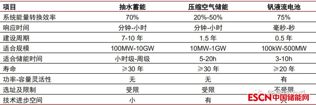 抽水蓄能作為最成熟可靠的儲(chǔ)能技術(shù),是國(guó)內(nèi)重點(diǎn)投資建設(shè)的儲(chǔ)能形式。抽水儲(chǔ)能的主要限制是項(xiàng)目的建設(shè)選址要求較高且建設(shè)周期較長(zhǎng)。壓縮空氣儲(chǔ)能也屬于成熟技術(shù),但系統(tǒng)的能量轉(zhuǎn)換效率偏低且項(xiàng)目選址也受限。