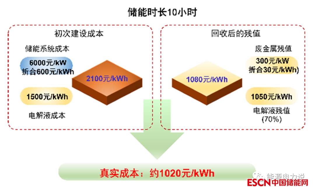 而對(duì)于儲(chǔ)能時(shí)長(zhǎng)為10小時(shí)的系統(tǒng)來(lái)說(shuō),廢金屬殘值折合為30元/kWh,合計(jì)殘值為1080元/kWh,實(shí)際成本僅為1020元/kWh。
