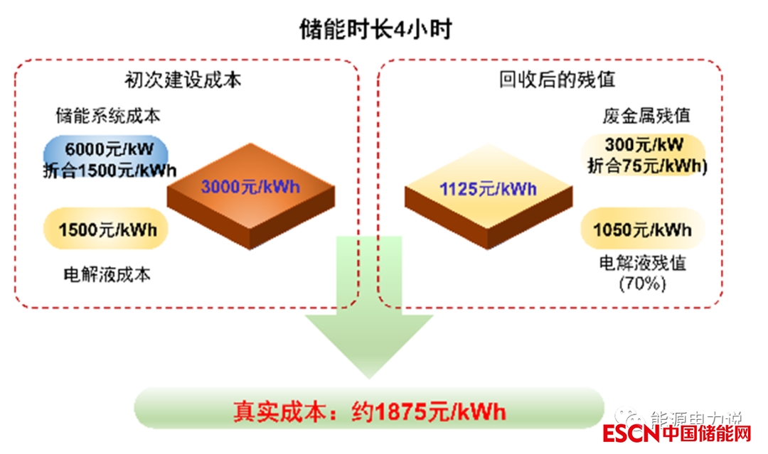 由于全釩液流電池的電解液可再生循環(huán)使用,因此其殘值很高。同樣以儲(chǔ)能時(shí)長(zhǎng)為4小時(shí)的釩液流電池儲(chǔ)能系統(tǒng)為例,其中廢金屬的殘值估值為300元/kW,折合為75元/kWh,電解液殘值約為原有的70%即1050元/kWh,合計(jì)殘值為1125元/kWh,實(shí)際成本為1875元/kWh。