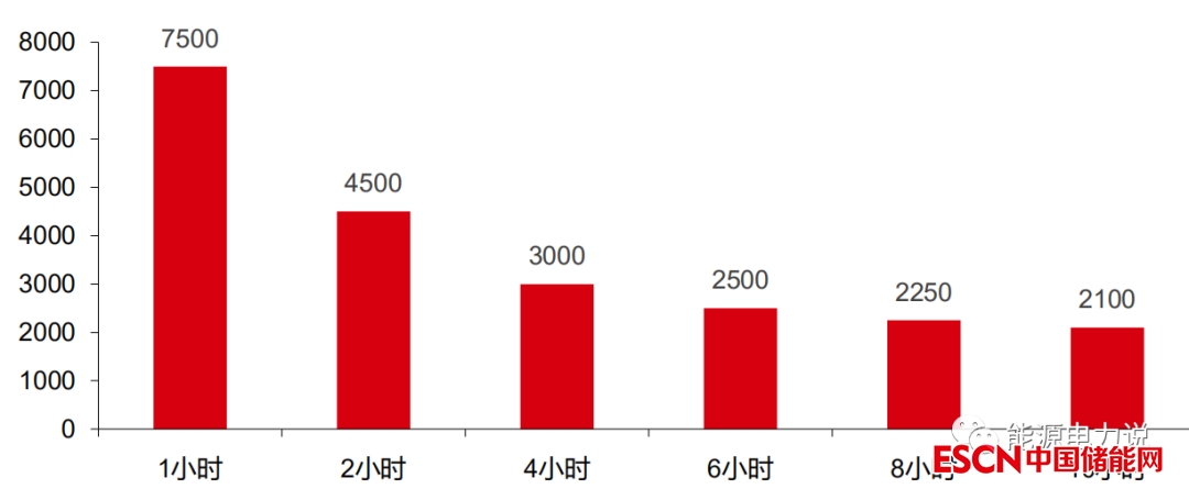 當(dāng)儲(chǔ)能時(shí)長(zhǎng)為1小時(shí)的情況下,儲(chǔ)能系統(tǒng)的初次投資成本為7500元/kWh,但當(dāng)儲(chǔ)能時(shí)長(zhǎng)延長(zhǎng)到4小時(shí)后,不包括電解液部分的價(jià)格則被分?jǐn)倿?500元/kWh,此時(shí)全釩液流電池儲(chǔ)能系統(tǒng)的總價(jià)格為 3000元/kWh。因此,全釩液流電池儲(chǔ)能系統(tǒng)工作時(shí)間越長(zhǎng),單位kWh價(jià)格越便宜。