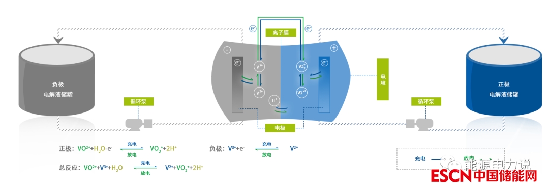 全釩液流電池,是一種以金屬釩離子為活性物質(zhì)的液態(tài)氧化還原可再生電池。全釩液流電池正、負(fù)極活性物質(zhì),分別儲(chǔ)存在獨(dú)立的電解液儲(chǔ)罐中。在對(duì)電池進(jìn)行充、放電時(shí),正負(fù)極電解液在離子交換膜兩側(cè)進(jìn)行氧化還原反應(yīng)。同時(shí),通過(guò)電堆外泵的作用,儲(chǔ)液罐中的電解液不斷送入正極室和負(fù)極室內(nèi),以維持離子的濃度,實(shí)現(xiàn)對(duì)電池的充放電。