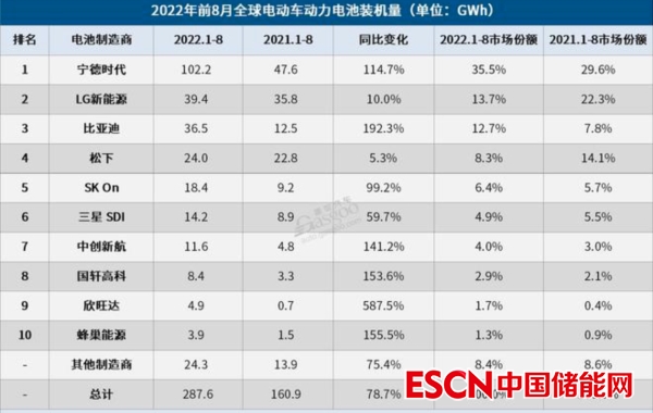 數(shù)據(jù)顯示,2022年1-8月,全球電動(dòng)汽車電池裝車總量達(dá)287.6 GWh,同比增長(zhǎng)78.7%。其中,中國(guó)企業(yè)寧德時(shí)代新能源股份有限公司(以下簡(jiǎn)稱“寧德時(shí)代”)繼續(xù)霸榜,累計(jì)裝機(jī)量達(dá)到了102.2 GWh,已超過了去年全年的96.7GWh。2022年1-8月,其全球市場(chǎng)份額為35.5%,較去年同期增長(zhǎng)5.9個(gè)百分點(diǎn)。