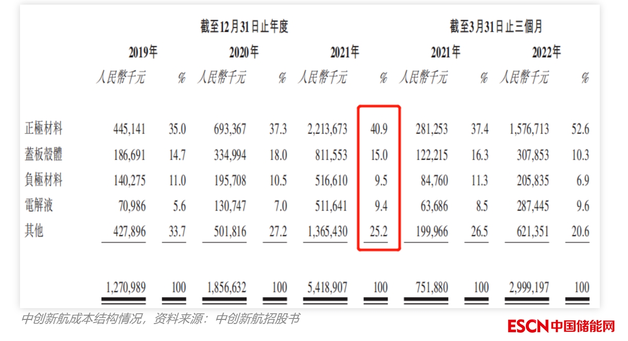 從成本結構上看,原材料成本是最主要的組成部分,占比近8成。進一步拆解原材料,主要由正極材料、負極材料、蓋板殼體和電解液四部分組成,2021年占比分別為40.9%、15.0%、9.5%和9.4%