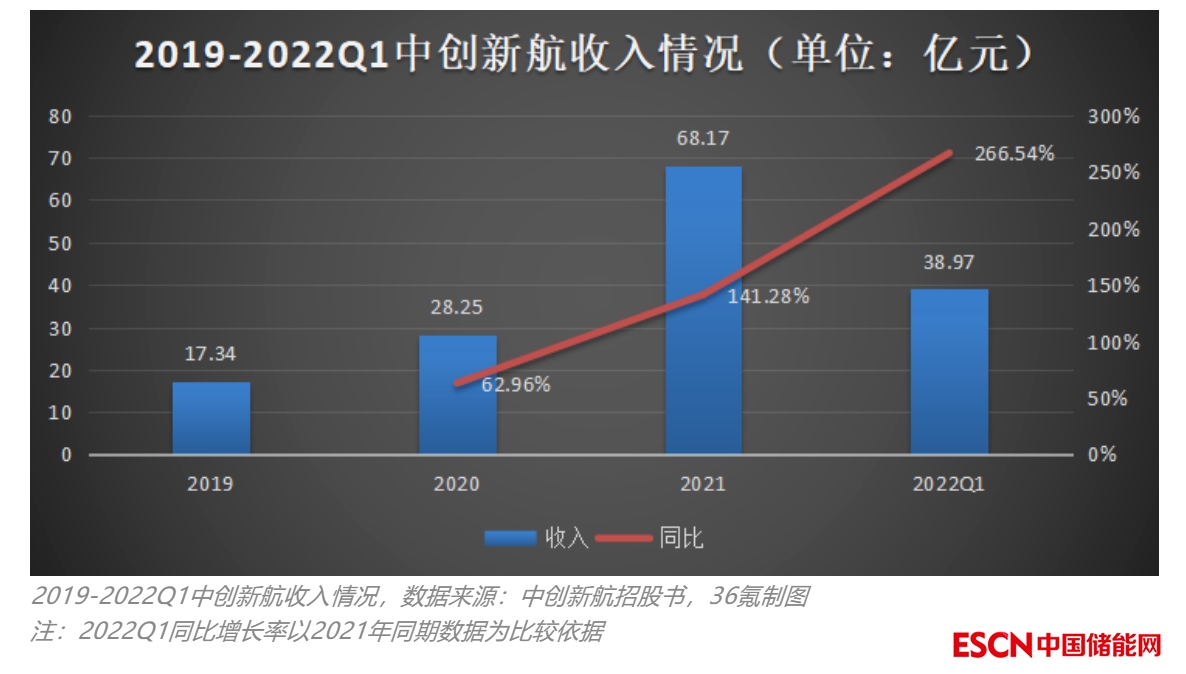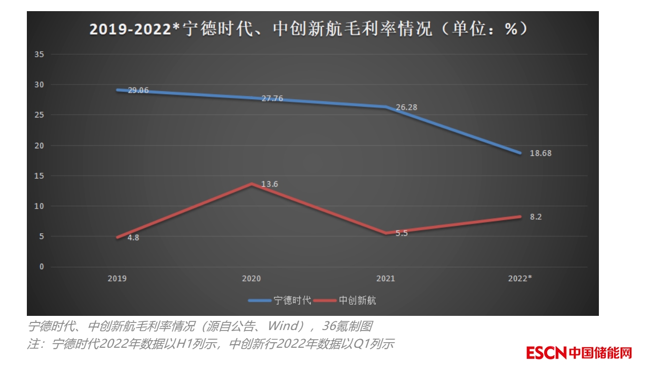 這就導致寧德時代在儲能上的毛利率降到了2022年H1的6.4%,同比下降了30%;中創(chuàng)新航在該業(yè)務的毛利率在2022年Q1為-7.9%,較2021年Q1的+13.9%下降了20%以上。根據東吳證券研究所數據,儲能業(yè)務預計能給寧德時代貢獻8億+的營收,再看中創(chuàng)新航,在手訂單4.22億。二者如影隨形。