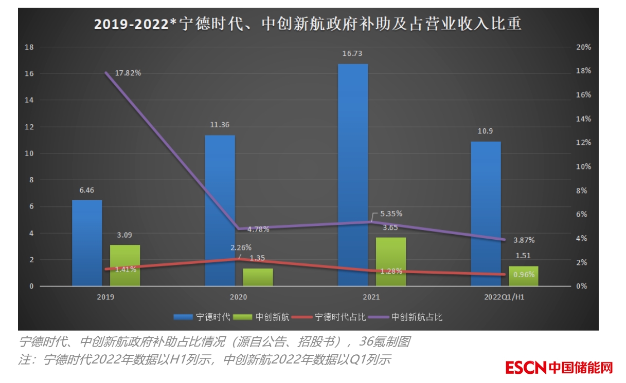 這個現象不止中創(chuàng)新航一家,龍頭寧德時代收到的政府補助要多得多,只不過跟寧德時代的千億收入相比,占比顯得很小。