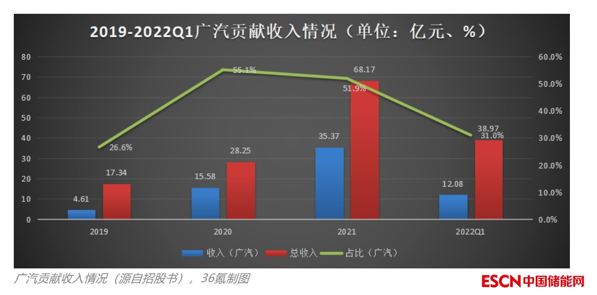 隨后的三年,廣汽集團都和中創(chuàng)新航簽訂了戰(zhàn)略采購協議。從金額上看,2019年廣汽集團貢獻了中創(chuàng)新航收入的26.6%,這個比例在2020年就上升到了55.1%。2020年略有下降,在51.9%。