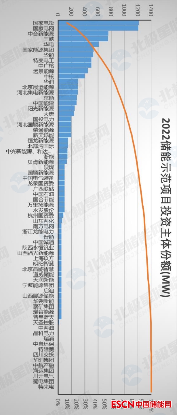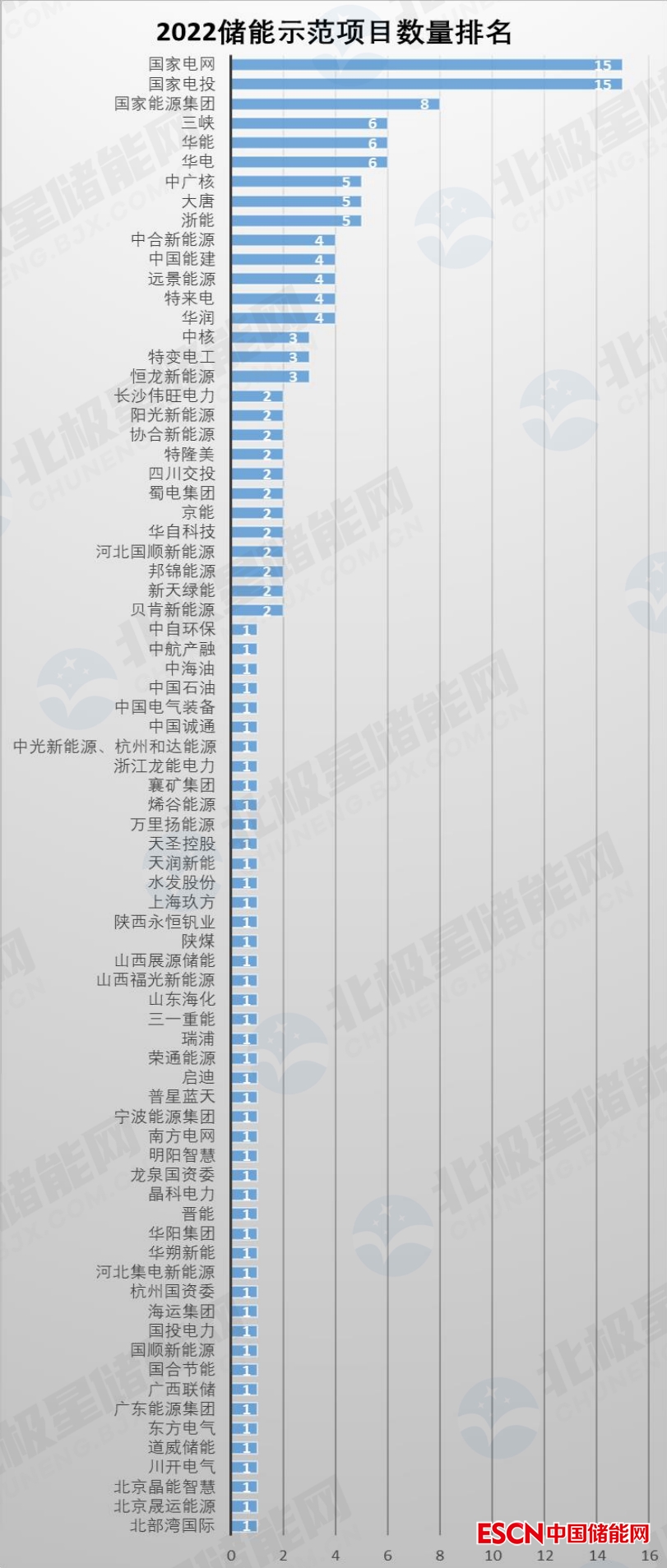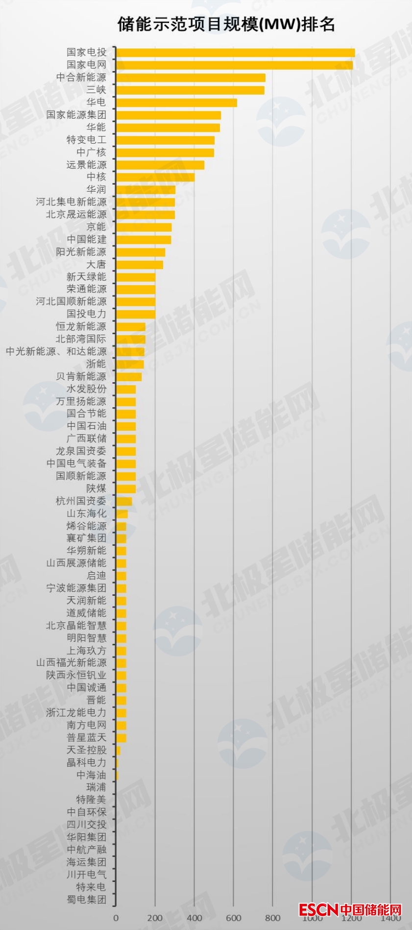 具體來看,國(guó)家電投和國(guó)家電網(wǎng)手上的儲(chǔ)能示范項(xiàng)目功率規(guī)模不相上下、均超過1.2GW,這兩大企業(yè)就占比超18%,隨后是其他發(fā)電集團(tuán)、擁有的儲(chǔ)能示范項(xiàng)目規(guī)模也都超過了500MW。