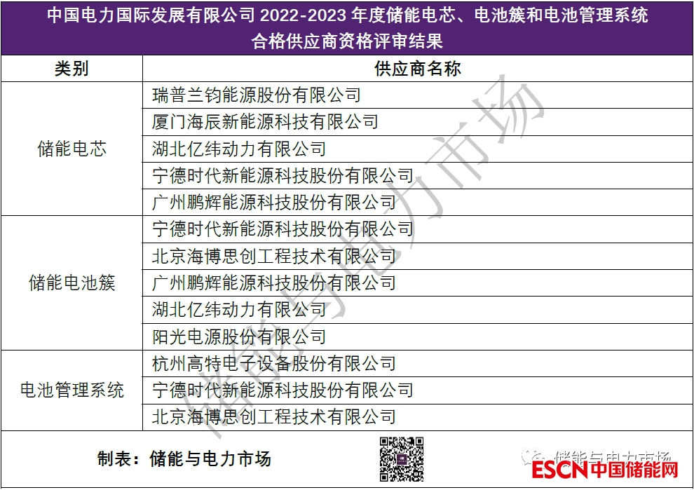 中國(guó)電力國(guó)際發(fā)展有限公司2022年在儲(chǔ)能領(lǐng)域頻繁出力,2022年4月曾發(fā)布過(guò)2022-2023年度儲(chǔ)能電芯、電池簇和電池管理系統(tǒng)合格供應(yīng)商資格評(píng)審結(jié)果,中標(biāo)結(jié)果如下。
