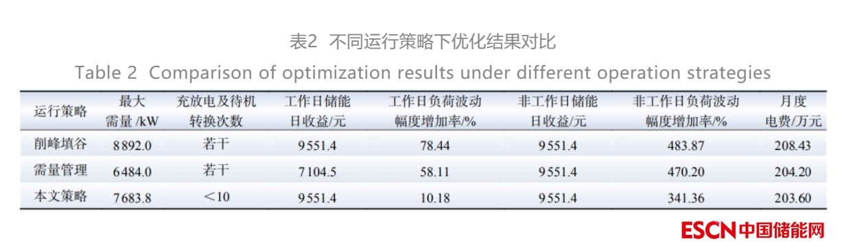 表2對比了不同運行策略下的優(yōu)化結(jié)果,最大需量方面,本文優(yōu)化策略的最大需量介于一般削峰填谷運行策略和需量管理運行策略之間;SOC過程控制方面,本文優(yōu)化策略的充放電及待機狀態(tài)轉(zhuǎn)換次數(shù)大幅減少;儲能收益方面,本文優(yōu)化策略的儲能工作日收益和削峰填谷運行策略一樣達到最大收益,比一般需量管理運行策略收益要大,幾種不同運行策略的非工作日儲能收益相同;在負荷波動幅度增加率方面,本文優(yōu)化策略的負荷波動幅度增加率最小,并且相比削峰填谷運行策略和需量管理運行策略,非工作日比工作日的負荷波動幅度增加率降低的更多,效果更顯著;在用戶最關(guān)心的月度用電成本上,本文優(yōu)化策略的月度電費最小。