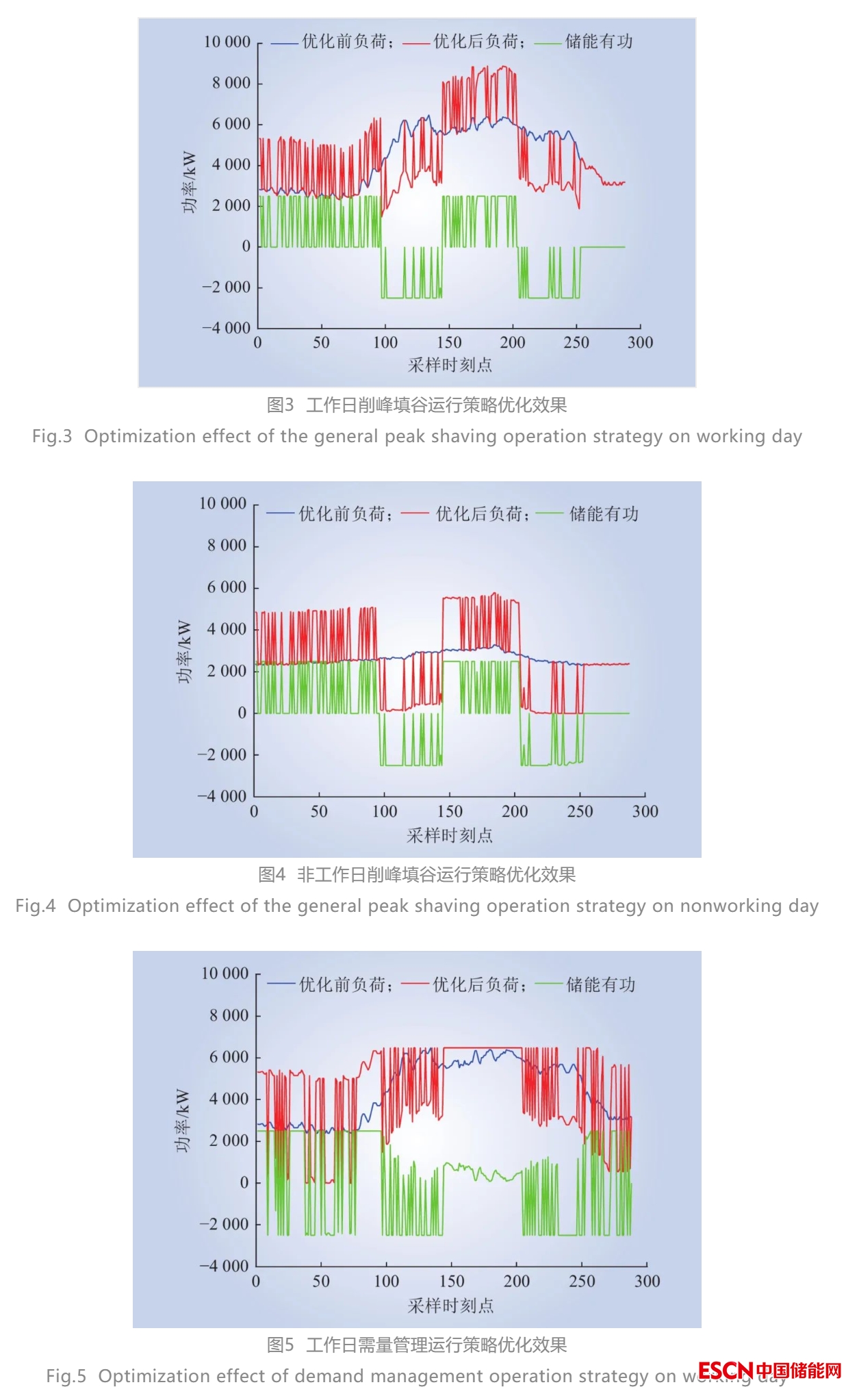 圖3和圖4為一般削峰填谷運行策略優(yōu)化結(jié)果,該策略僅考慮峰谷套利最大化。可以看出,一般削峰填谷運行策略在各時段內(nèi)的充放電隨機無序,導致充放電及待機狀態(tài)轉(zhuǎn)換次數(shù)較多;儲能優(yōu)化后的負荷最大需量大幅增加,同時負荷波動幅度比優(yōu)化前增大很多,尤其在非工作日情況下負荷波動幅度成倍增長。