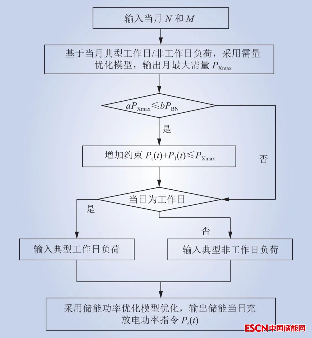 區(qū)分工作/非工作日負荷的用戶側(cè)儲能多目標優(yōu)化策略主要由需量優(yōu)化模型和儲能功率優(yōu)化模型構(gòu)成,通過需量優(yōu)化模型計算出月最大需量 PXmax ,再用儲能功率優(yōu)化模型求得儲能充放電功率,主要流程如圖1所示。其中,b 為用戶變壓器容量單價,元/(kW·月);PBN 為用戶變壓器容量。