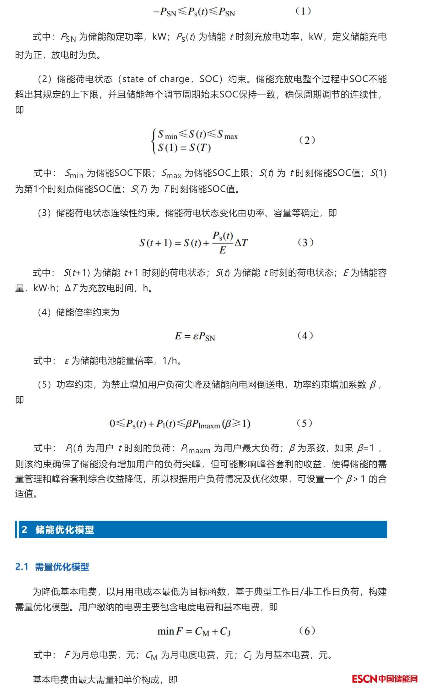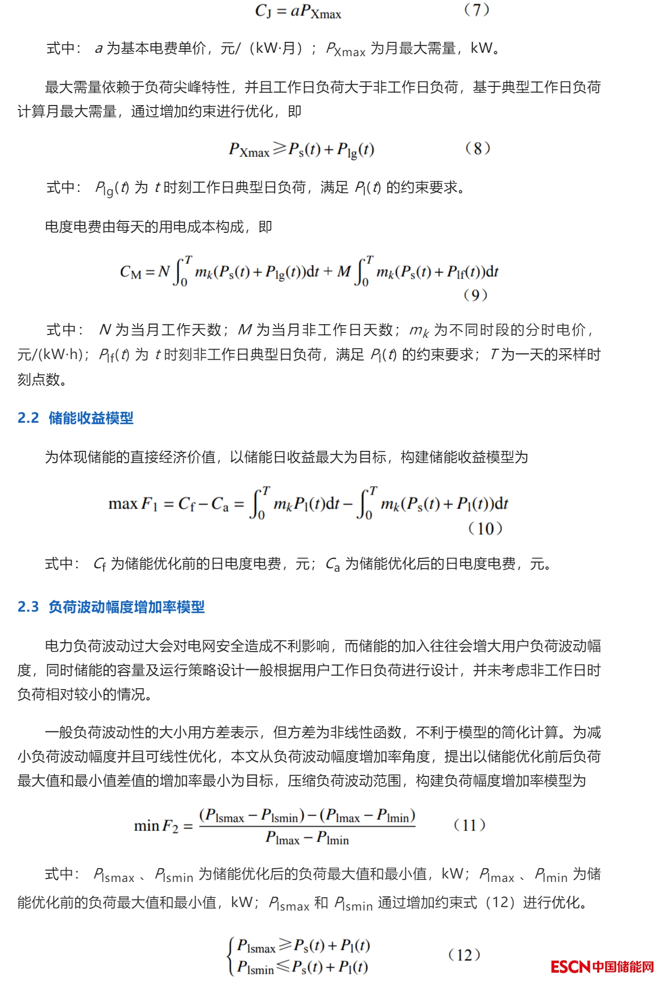 在實際工程應(yīng)用中,對于已安裝儲能的用戶,目前大部分都依據(jù)峰平谷電價時間段,采用最大化利用峰平谷電價差產(chǎn)生削峰填谷收益的控制策略。但該策略可能造成月最大需量的提高,導致用戶雖然降低了電度電費,但增加了基本電費,綜合收益較低。對于大工業(yè)用戶或制造業(yè)用戶,其需量電費會占到總電費的20%左右[11],如果對需量電費進行管理,則能夠直接降低用電成本。文獻[12-13]考慮了峰谷套利的優(yōu)化運行,并未考慮需量管理。文獻[14]采用兩階段模型進行儲能配置和運行優(yōu)化,未考慮儲能充放電狀態(tài)轉(zhuǎn)換次數(shù),增加了儲能運行損耗。文獻[15]考慮不同用戶側(cè)儲能配置評估與運行優(yōu)化模型,重點研究了不同用戶的儲能優(yōu)化配置。文獻[16]考慮了功率因數(shù)調(diào)整對電費的影響,雖然增加了需量約束,但是并未對需量管理進行優(yōu)化。文獻[17]提出雙層決策模型,加入需量因素,但并未考慮儲能每日充放電次數(shù)過多對儲能電池壽命的影響。文獻[18]增加了儲能吞吐量約束,但也只能減少充放電狀態(tài)轉(zhuǎn)換的次數(shù),而不能明顯降低充放電狀態(tài)與待機狀態(tài)的轉(zhuǎn)換次數(shù)。文獻[19-21]以配電網(wǎng)網(wǎng)損和電壓偏差最小為目標進行儲能運行優(yōu)化。文獻[22-24]則加入光伏、空調(diào)等柔性可調(diào)負荷的因素進行儲能優(yōu)化配置。目前的儲能容量設(shè)計及運行策略一般是基于正常工作負荷進行的設(shè)計與優(yōu)化,并未區(qū)分工作日負荷及非工作日負荷,法定節(jié)假日使非工作日天數(shù)占比增加,直接影響儲能的經(jīng)濟性優(yōu)化。