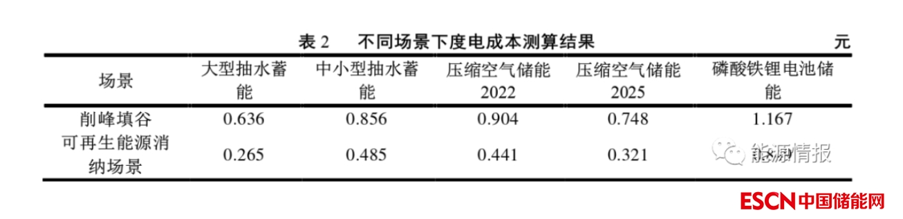 在削峰填谷和電源側(cè)可再生能源消納(利用新能源基地棄風(fēng)棄光充電,不考慮充電成本)2種場景下,采用平準(zhǔn)化電力成本方法分析比較了不同的儲能技術(shù)的全壽命期度電成本,考慮了工程建設(shè)成本、運(yùn)維成本、儲能成本,對比抽水蓄能、中小型抽水蓄能、壓縮空氣儲能2022(現(xiàn)水平)和2025(“十四五”末發(fā)展水平)、電化學(xué)儲能5種儲能形式,初步測算成果見表2。