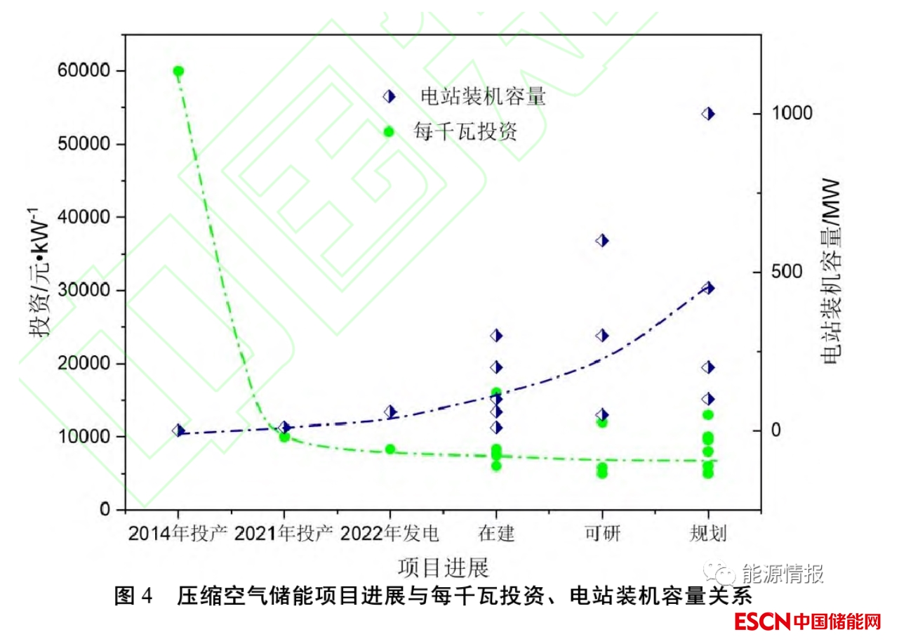 壓縮空氣儲能項(xiàng)目進(jìn)展與每千瓦投資、項(xiàng)目裝機(jī)容量關(guān)系見圖4。從圖4可知,壓縮空氣儲能電站的機(jī)組容量隨著技術(shù)迭代更新正逐步增大,每千瓦投資在逐步減少,相應(yīng)的期建設(shè)成本仍處于下降過程中。如國內(nèi)第1個投運(yùn)的非補(bǔ)燃壓縮空氣示范項(xiàng)目蕪湖電站裝機(jī)500kW,其投資約60000元/kW;肥城一期電站裝機(jī)10MW,其投資約10000元/kW;金壇項(xiàng)目和目前正在建設(shè)的張北、云崗井田項(xiàng)目投資約8000元/kW,已與中小型抽水蓄能建設(shè)成本相當(dāng);部分可研階段和規(guī)劃階段的壓縮空氣儲能項(xiàng)目,估算投資約5000~6000元/kW,已與大型抽水蓄能電站相當(dāng)。