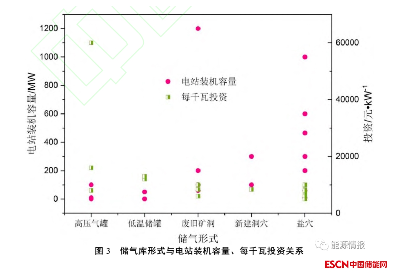 壓縮空氣儲能儲氣庫包括高壓氣罐、低溫儲罐、廢舊礦洞、新建洞穴、鹽穴等多種形式。儲氣庫形式與機(jī)組容量、每千瓦投資關(guān)系見圖3。圖3中,機(jī)組容量為電站總裝機(jī)容量,400~1200MW容量一般裝機(jī)2~4臺。對我國規(guī)劃、可研、在建、已建項(xiàng)目的統(tǒng)計(jì)分析可知,鹽穴儲氣庫機(jī)組容量多較大,其每千瓦投資相對較低;廢舊礦洞和新建洞穴也多可用作大型電站建設(shè),每千瓦投資稍高于鹽穴建庫;而低溫儲罐和高壓氣罐一般用于中小型電站,且多處于試驗(yàn)階段,現(xiàn)階段其每千瓦平均投資普遍比地下儲氣庫高。由于大型壓縮空氣儲能電站需要較大的儲氣空間,而地上儲氣罐(管)價格昂貴,現(xiàn)階段在建、已投產(chǎn)項(xiàng)目多采用地下儲氣庫,即鹽穴、新建洞穴和礦洞改造3種形式。本文就此3種形式的儲氣庫做重點(diǎn)論述。