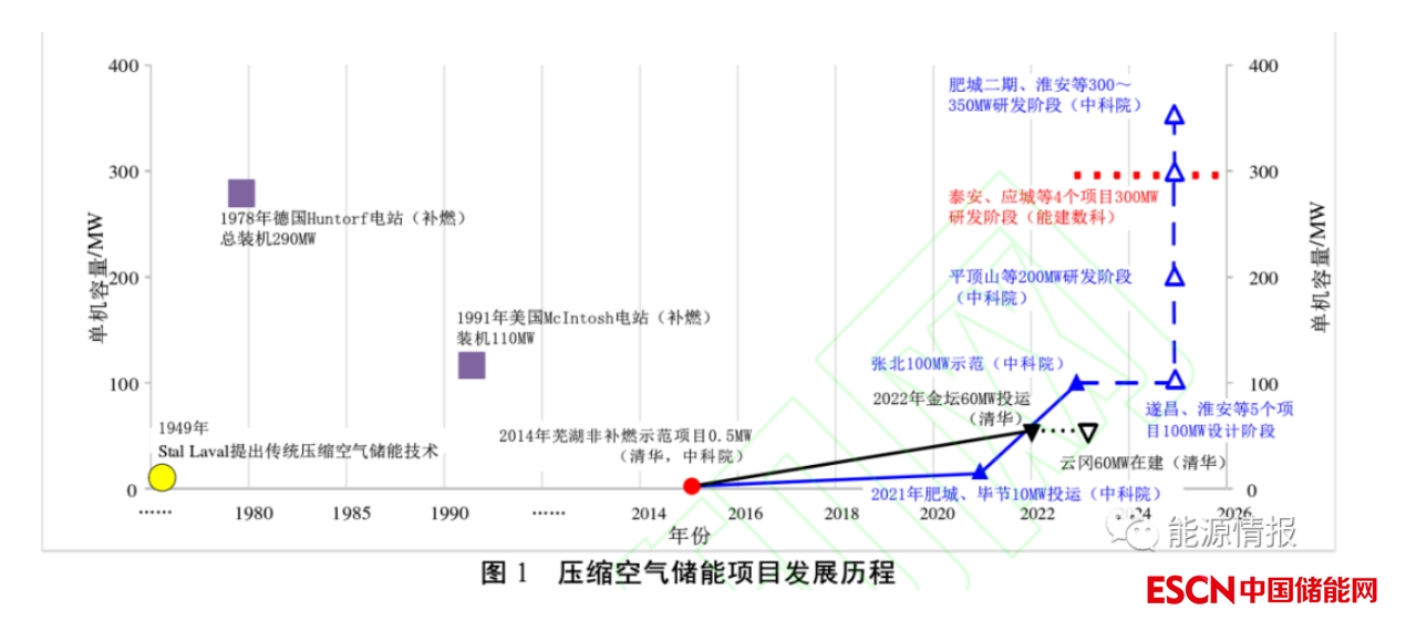 此外,肥城(二期)300MW級壓縮空氣儲能電站和中國能建數(shù)科集團(tuán)的平頂山(200MW)、泰安(300MW)等項(xiàng)目近期完成了可行性研究。當(dāng)前,100MW級壓縮空氣儲能項(xiàng)目正在開展示范應(yīng)用。規(guī)劃或設(shè)計(jì)階段的一大批壓縮空氣儲能項(xiàng)目,裝機(jī)規(guī)模逐步由100MW發(fā)展到200MW或300MW。壓縮空氣儲能技術(shù)正由示范應(yīng)用階段,轉(zhuǎn)向初期商業(yè)化發(fā)展階段。壓縮空氣儲能項(xiàng)目發(fā)展歷程見圖1。