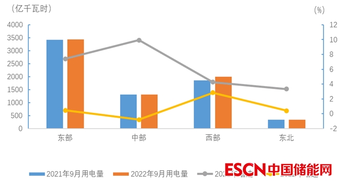 9月份,東、中、西部和東北地區(qū)全社會用電量增速分別為0.5%、-0.8%、2.9%和0.4%。