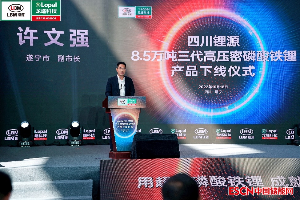 中國儲能網(wǎng)訊:10月18日上午,全球目前產(chǎn)能最大的三代高壓密磷酸鐵鋰生產(chǎn)線——四川鋰源新材料有限公司8.5萬噸三代高壓實密度磷酸鐵鋰產(chǎn)品下線儀式在四川遂寧隆重舉行。遂寧市副市長許文強(qiáng)、蓬溪縣委書記黃亞軍、四川鋰源母公司龍蟠科技黨委書記呂振亞、四川鋰源總經(jīng)理楊志寬以及來自多家客戶和供應(yīng)商的代表應(yīng)邀出席。