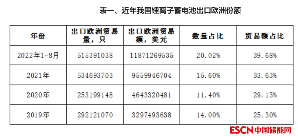 一、歐洲一直是我國鋰離子電池產(chǎn)品出口的主要目的地,2022年從貿(mào)易額上看已成為我國鋰離子電池產(chǎn)品出口的最大目的地。我國海關數(shù)據(jù)顯示,2019年–2021年,我國鋰離子蓄電池出口到歐洲的數(shù)量占出口總量的15%左右;出口額逐年增加,占比在30%左右。2022年1–8月,貿(mào)易量和貿(mào)易額占比分別提高到20%和40%,與歐洲的貿(mào)易量僅次于亞洲地區(qū),貿(mào)易額則排名第一。歐洲已成為我國鋰離子電池出口的最大目的地,對我國鋰離子電池企業(yè)來說是非常重要的市場。