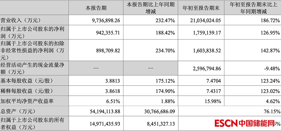 10月21日,寧德時(shí)代發(fā)布第三季度財(cái)報(bào)。今年第三季度,寧德時(shí)代營業(yè)收入973.69億元,同比大增232.47%,歸屬于上市公司股東的凈利潤94.23億元,同比增長188.42%。今年前三季度,寧德時(shí)代實(shí)現(xiàn)營收2103.40億元,同比增長186.72%;凈利潤175.92億元,同比增長126.95%;其中,前三季度凈利潤已超2021年全年凈利,2021年寧德時(shí)代凈利為159億元。