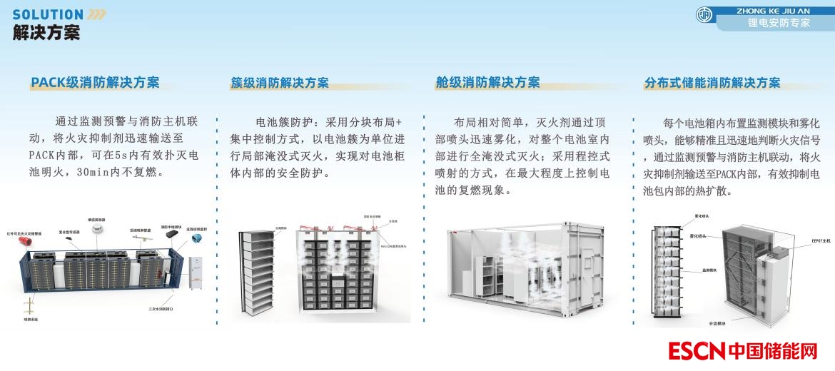為推動儲能產業(yè)健康發(fā)展,針對行業(yè)痛點,安徽中科久安有限公司自主研發(fā)的程控式“電化學儲能系統(tǒng)熱失控監(jiān)測預警及防護系統(tǒng)”,可運用通過多參數耦合探測技術(溫度、煙霧、特征氣體、火焰等)與鋰離子電池熱失控預測模型的有機結合,實現對電池火災的精準判斷和多級預警。消防方面運用滅火效率高、絕緣性能好、環(huán)保潔凈的全氟己酮滅火劑,其獨特的點動噴射技術可實現對熱失控電池的快速撲救和長效抑制。該系統(tǒng)利用同一管路及噴組,兼容二次水消防,可實現對電化學儲能電站火災的多級防護。