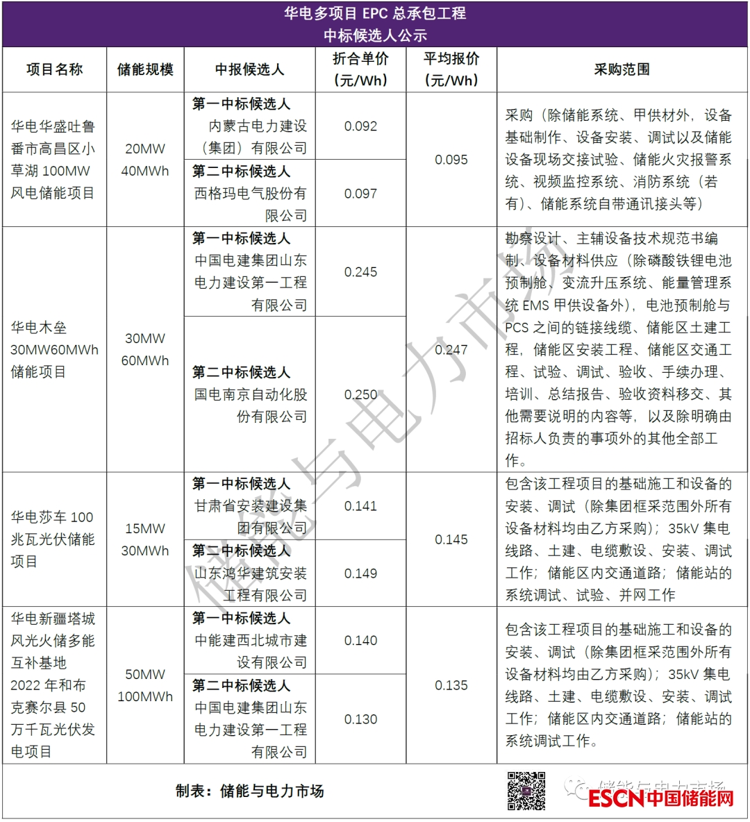 中國儲能網訊:近日華電新疆多個項目發(fā)布了EPC工程中標公告(不包含儲能設備采購),中標平均價位于0.095-0.247元/Wh之間。如下表所示。