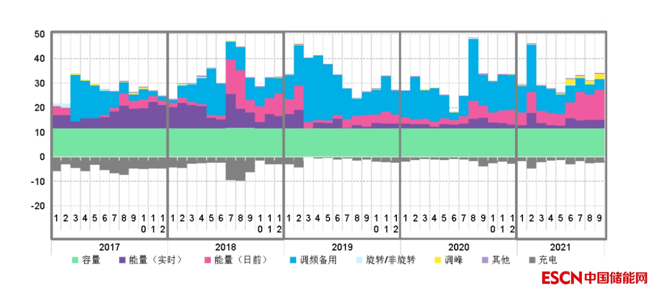 自2021年起,儲(chǔ)能項(xiàng)目從能量轉(zhuǎn)移和價(jià)格套利服務(wù)中獲得的收入,比調(diào)頻收入更多。這是因?yàn)檎{(diào)頻價(jià)格在2020年和2019年較高,但在2021年有所下降。由于未來輔助服務(wù)收入回報(bào)可能會(huì)更低,儲(chǔ)能運(yùn)營商正在尋找其他機(jī)會(huì)。