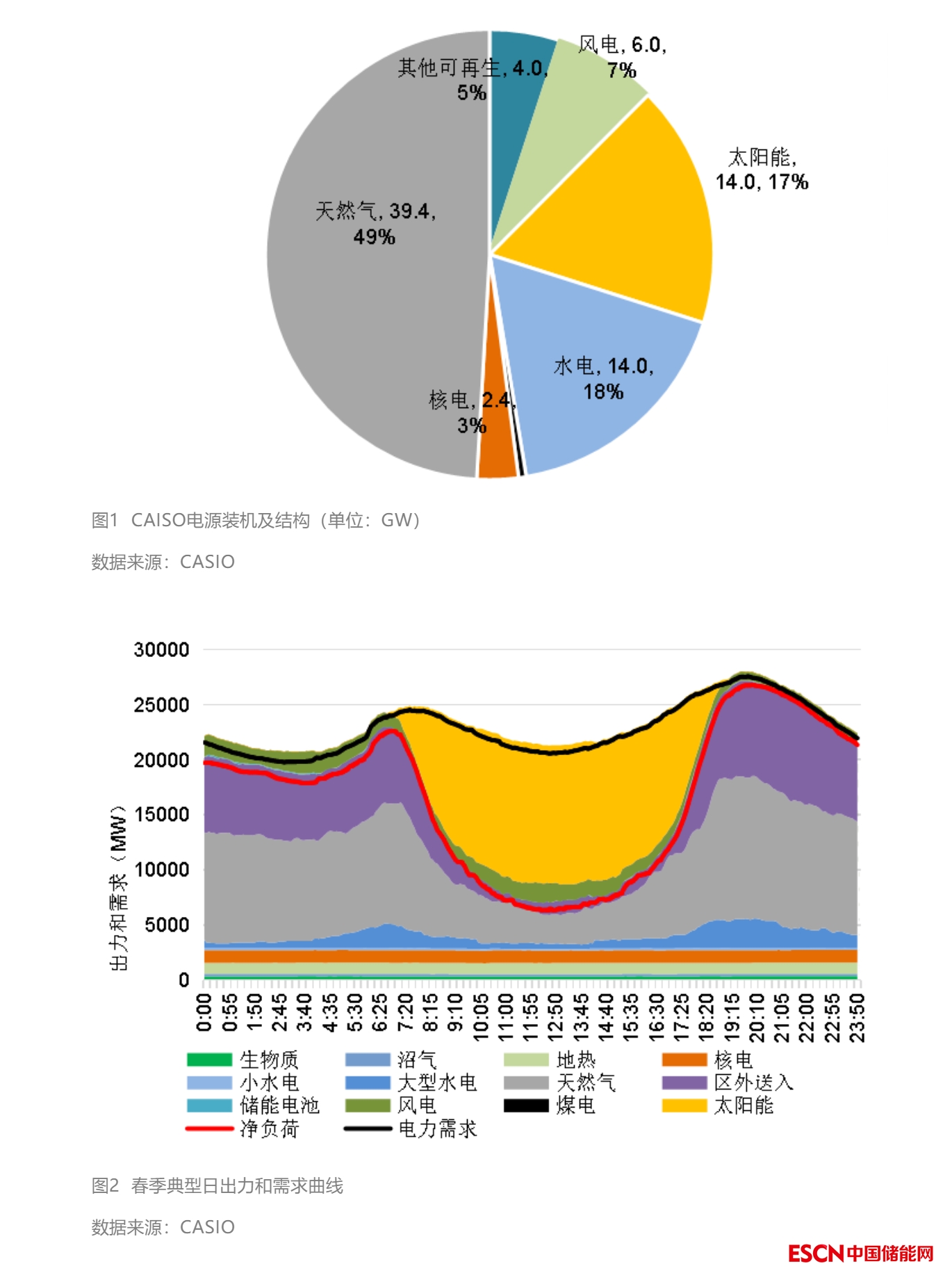 加州本地電源裝機(jī)容量中,天然氣發(fā)電、非化石能源發(fā)電各占接近一半。加州日照時(shí)間長,平均日照峰時(shí)超過5小時(shí),電源裝機(jī)為80GW,其中太陽能發(fā)電裝機(jī)接近14GW,約占17%。此外,加州是電力受入州,外購電量占全年用電量的32%左右。在一年之中,風(fēng)光發(fā)電出力占全部電源出力的比重最大能達(dá)到66%,因此加州是典型的高比例新能源發(fā)電系統(tǒng)。日負(fù)荷在晚間達(dá)到峰值,導(dǎo)致從太陽下山開始需要?dú)怆姶罅俊⒖焖俚赝度胂到y(tǒng)進(jìn)行平衡調(diào)節(jié)。電池儲(chǔ)能非常適合加州市場,它能夠?qū)⒋罅康墓夥l(fā)電量時(shí)移至用電高峰期。