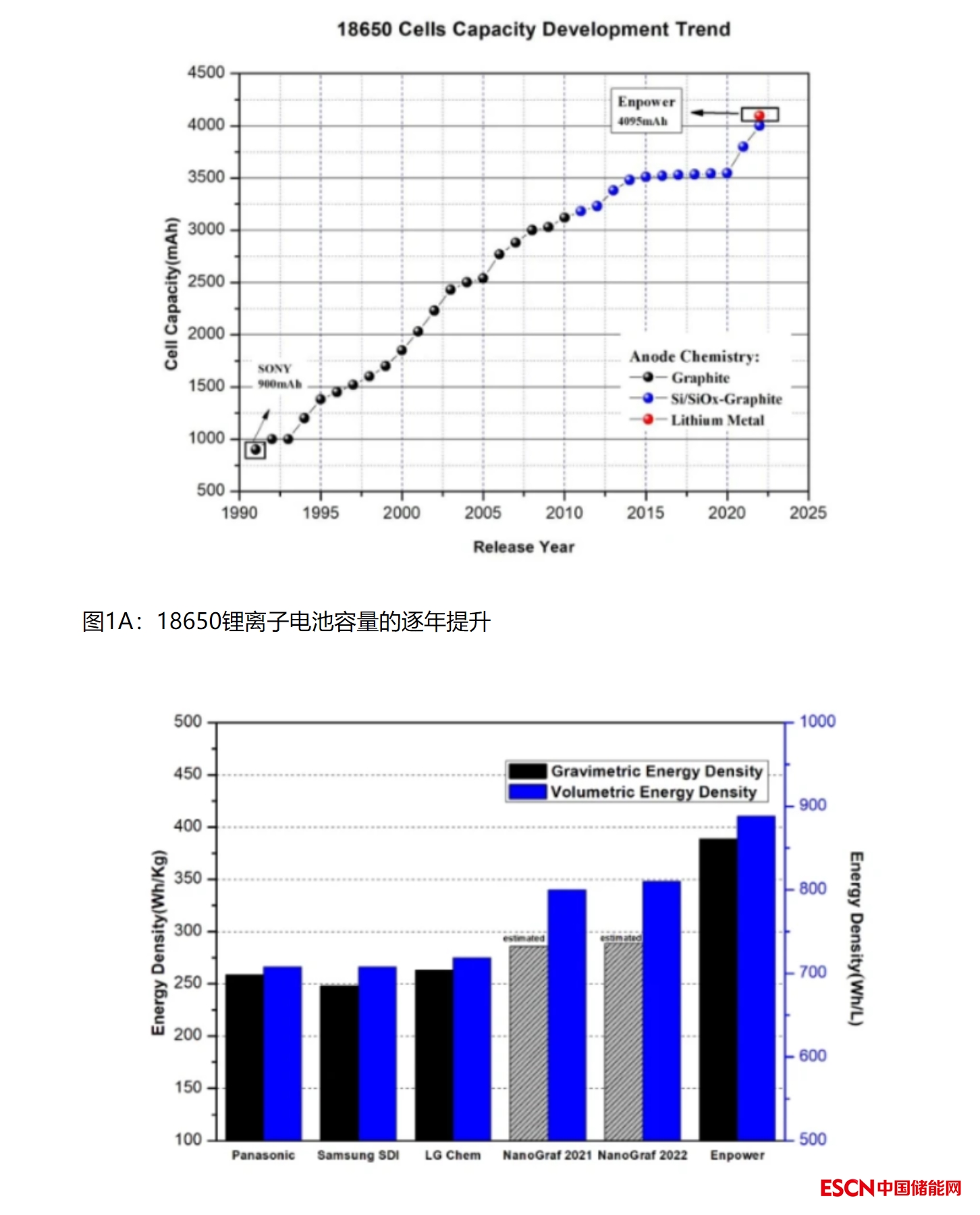 雖然索尼公司的18650鋰離子電池是一款劃時(shí)代的產(chǎn)品,但其容量只有900mAh(如圖1A所示)。在過去的30年里,18650電池的容量逐年提升,2015年,日本松下公司推出了容量為3450mAh的18650電池。此后,18650電池的容量似乎遇到了瓶頸,在此期間韓國和中國的圓柱電池制造商也先后推出了容量接近3500mAh的18650產(chǎn)品。直到2021年,美國初創(chuàng)公司NanoGraf宣布使用硅基負(fù)極推出自己的18650電池,容量高達(dá)3800mAh(3.8Ah)。今年10月,NanoGraf進(jìn)一步宣布將容量增加至4000mAh(4.0Ah)。另外,近年來“下一代”電池(包括鋰金屬電池及固態(tài)電池)的大多數(shù)發(fā)展多以軟包電池的形態(tài)出現(xiàn),鮮有圓柱形的電池。