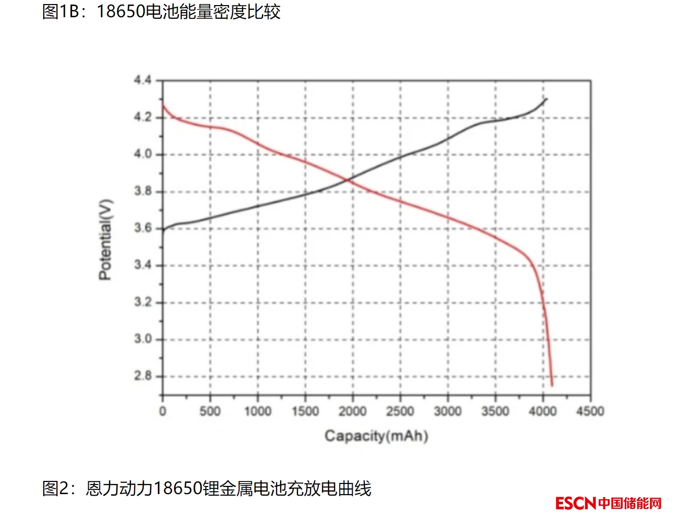 在過去的三年里,恩力動(dòng)力成功地開發(fā)了破紀(jì)錄的高比能鋰金屬軟包電池。公司利用在鋰金屬負(fù)極上的專利技術(shù),又一款破紀(jì)錄的高容量18650圓柱電池應(yīng)運(yùn)而生。與使用硅基負(fù)極的18650圓柱電池相比,恩力動(dòng)力的18650圓柱鋰金屬電池標(biāo)稱電壓提升了100-200mV,電池容量提高到了4095mAh(圖2),電池重量減少了近20%,重量能量密度得到了大幅提升(圖1B)。此外,如表1所示,恩力動(dòng)力的LMB18650-4.1Ah電池在容量、標(biāo)稱電壓和能量密度上均達(dá)到了新的里程碑。